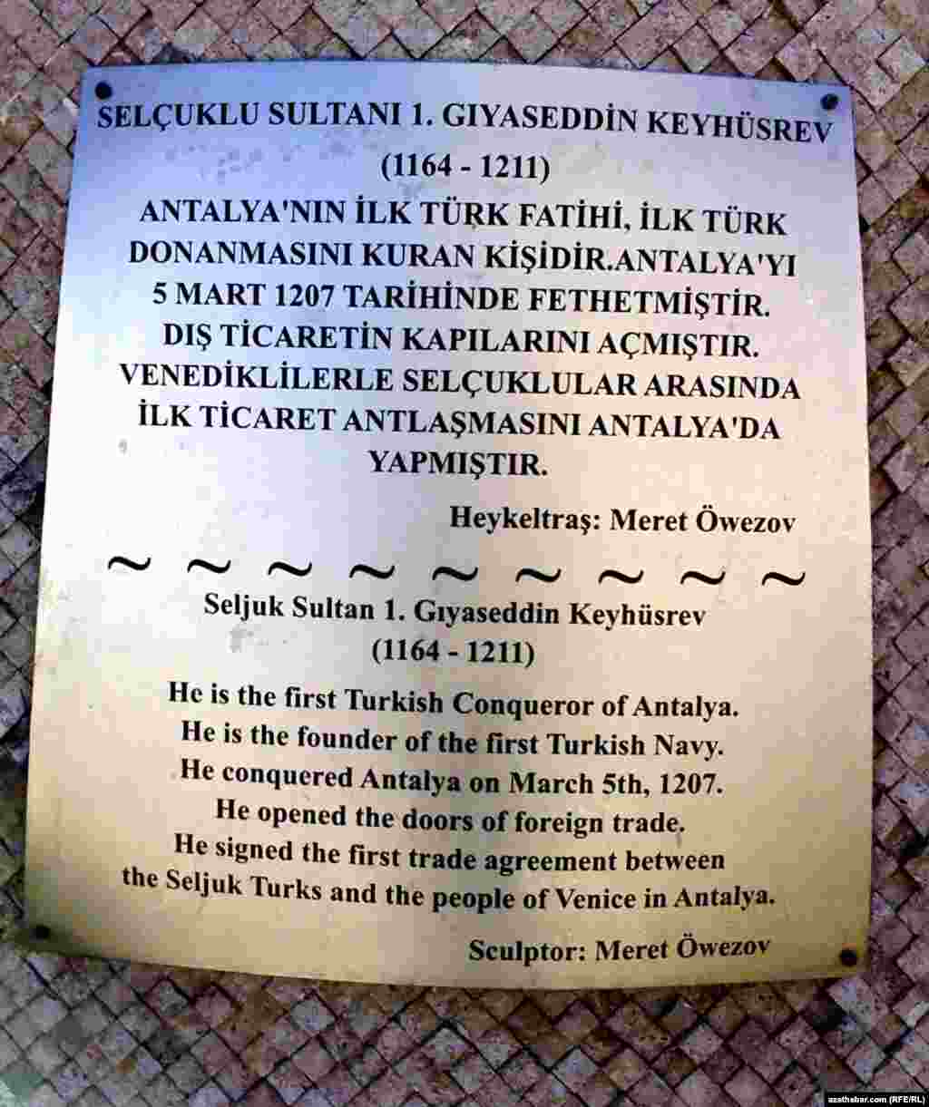 Türkmenistanly heýkeltraş Meret Öwezowyň ýasan Seljuk döwletiniň soltany Gylyçarslan Kyýasetdin Keýhüsrewiniň Antalýadaky heýkeli.