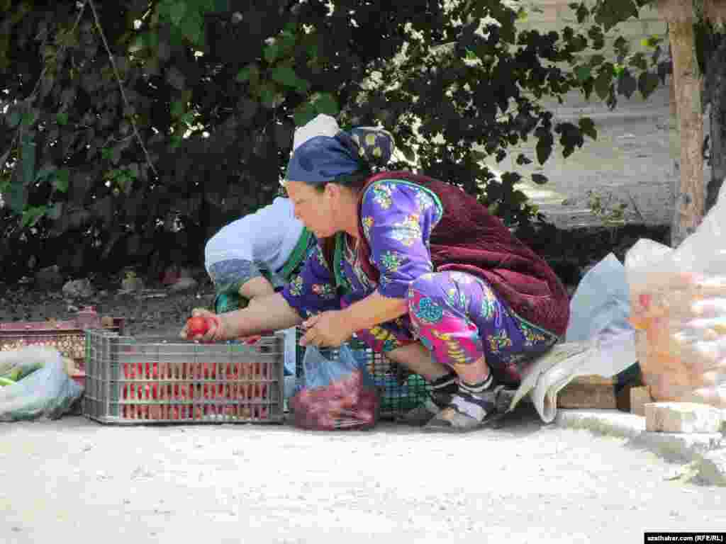 Köçäniň gyrasynda gök-önüm satyp oturan daýzalar. Aşgabat