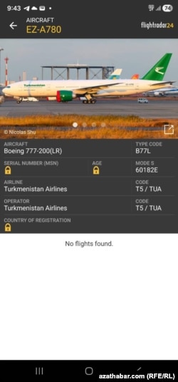 "FlightRadar"-yň özünde Gurbanguly Berdimuhamedowyň Türkmenistandan ugran uçarynyň hereketine degişli maglumat ýapyk dur.