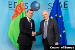 Türkmenistanyň daşary işler ministri Raşid Meredow (sagda) we ÝB-niň daşary syýasat boýunça başlygy Josep Borell